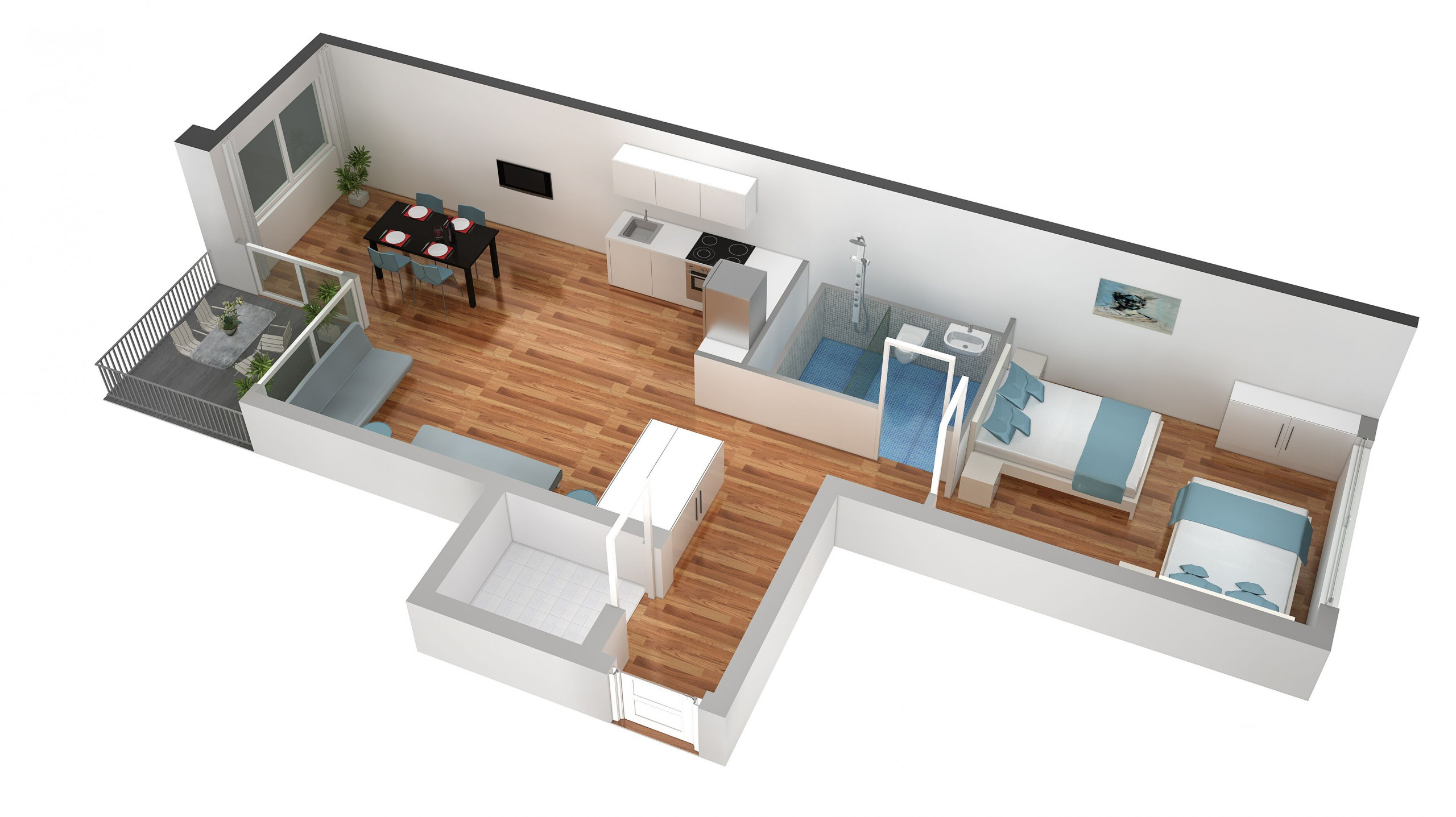 Die Unterkunft kann sechs Gäste unterbringen und besteht aus einem Schlafzimmer mit zwei grossen Doppelbetten, einem Wohnzimmer, moderner Küche, Badezimmer und einem Balkon. Zusätzlich zu den zwei Doppelbetten gibt es im Wohnzimmer zwei Schlafsofas für je eine Person. An das Wohnzimmer angrenzend befindet sich die moderne Küche, die mit allen Möglichkeiten zum Kochen ausgestattet ist. Sie finden dort Herdplatten, einen Backofen, Kühlschrank, Mikrowelle, Geschirrspülmaschine, Kaffeemaschine und weitere nützliche Küchenutensilien.