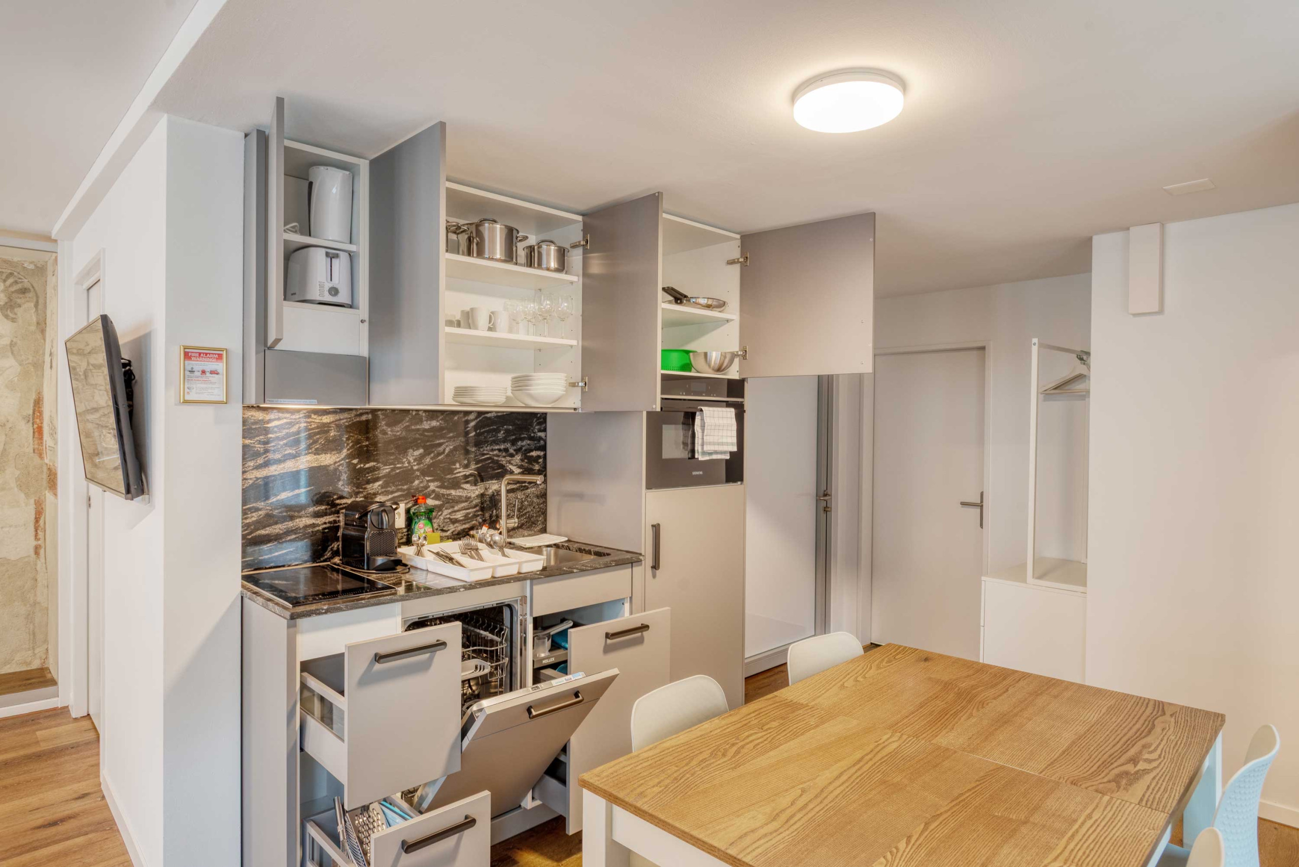Die offene Küche mit elektrischem Kochfeld ist modern ausgestattet und enthält alles, was Sie für die Zubereitung Ihrer Mahlzeiten brauchen: Kühlschrank, Gefrierschrank, Geschirrspüler, Geschirr und Besteck, Kochutensilien, Kaffeemaschine, Toaster und Wasserkocher.