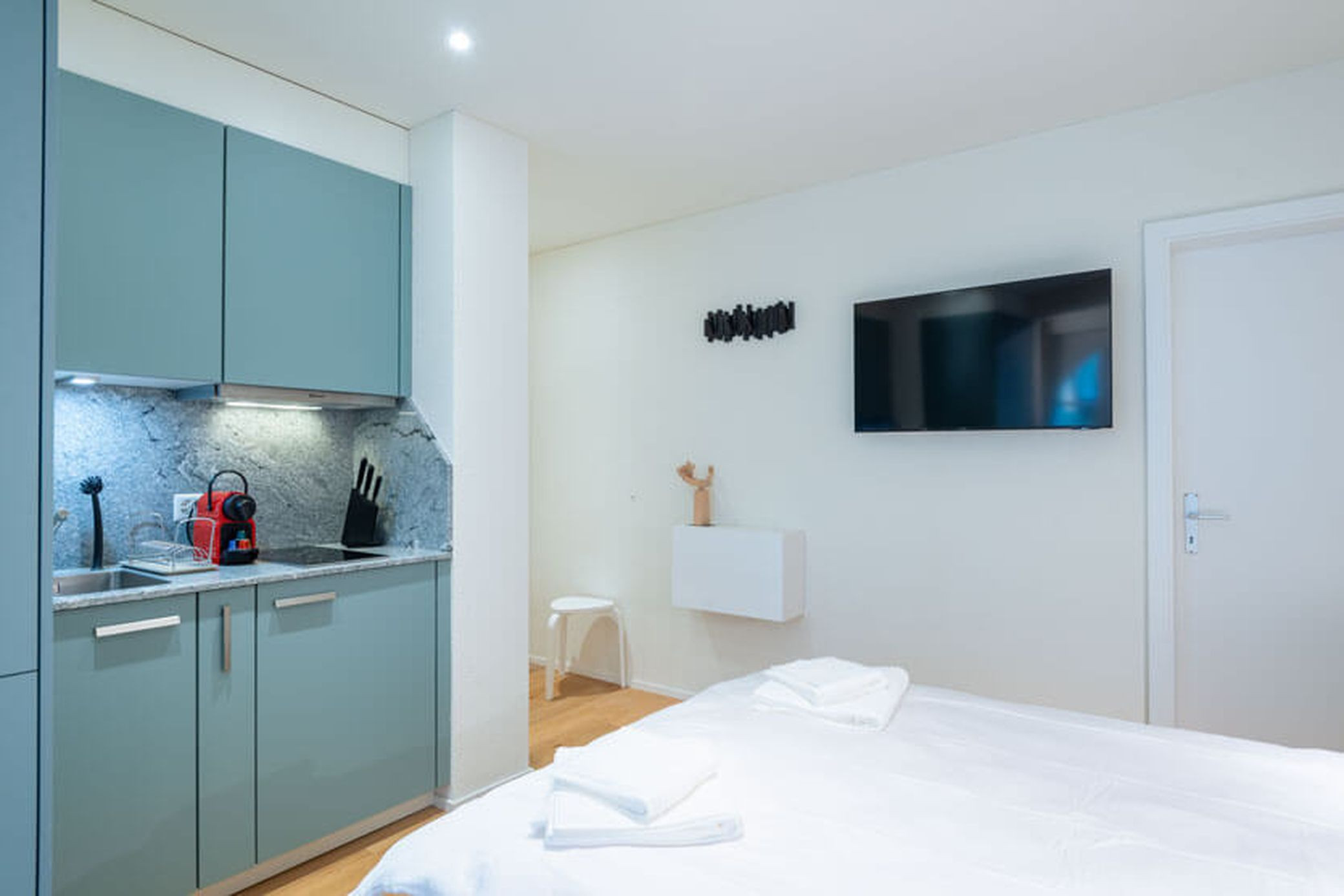 Das Studio Apartment namens "Cranberry II" ist eine Lösung für Ihren Geschäftsaufenthalt in Zürich. Das möblierte Studio Apartment hat 1 Zimmer und bietet auf 18 m2 den höchsten Wohnkomfort an. Das Studio in Zürich Oerlikon kann maximal zwei Personen beherbergen, verfügt über ein geräumiges Wohn-Schlafzimmer mit Doppelbett und eine eigene, komplett ausgestattete Küche. Das Badezimmer bietet neben der gewöhnlichen Ausstattung mit Dusche und WC auch Hygieneartikel und einen Haartrockner an.