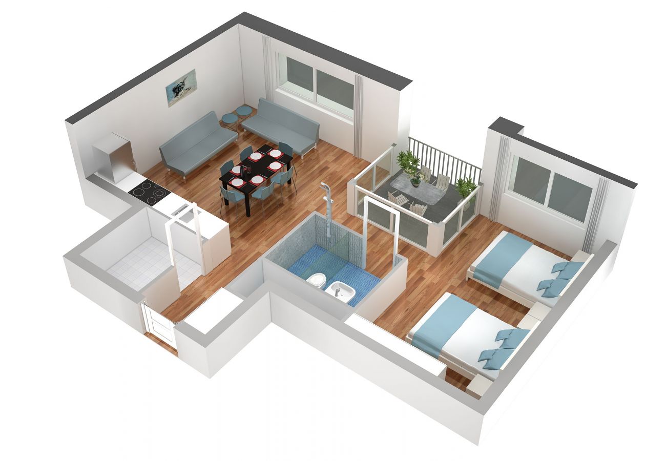 L'appartement a 52m2 et offre assez d'espace pour six personnes. Il y a deux grands lits doubles dans la chambre. Le salon est équipé de deux canapés-lits ainsi que d'un coin salon avec table et chaises. La cuisine ouverte est entièrement équipée. Vous y trouverez des cuisinières, un four, un micro-ondes, un réfrigérateur, un lave-vaisselle et une machine à café. La salle de bains est équipée de WC, douche, sèche-cheveux et d'un set de base de savon et shampoing.
