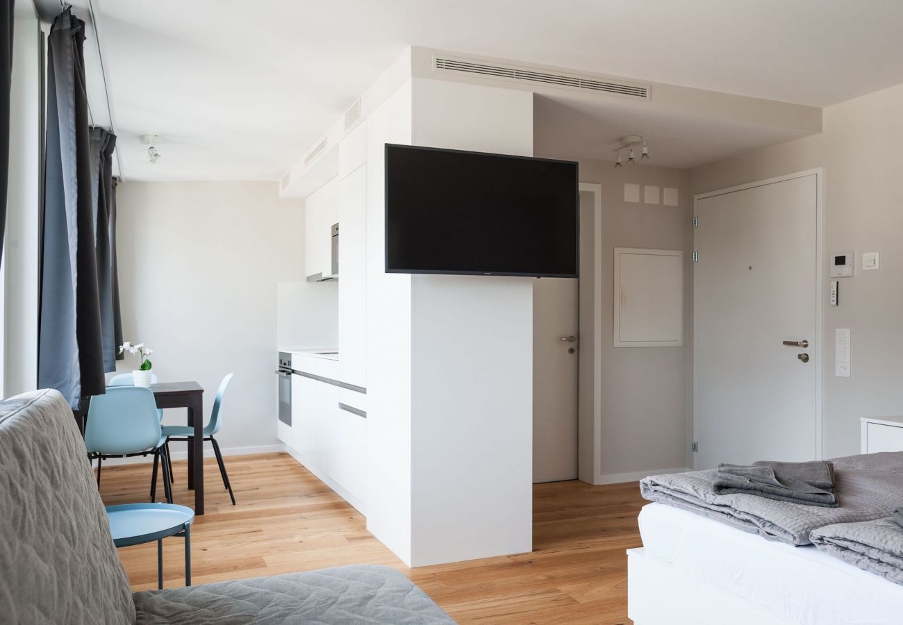 Le studio est situé dans un immeuble neuf, construit selon les normes les plus modernes. Un ascenseur est disponible et le bâtiment est entièrement accessible en fauteuil roulant. Dans le bâtiment, il y a une buanderie avec trois tours de lavage que vous pouvez utiliser gratuitement. Notre service comprend également Internet Wi-Fi, TV avec chaînes internationales, draps et serviettes. Tous les frais supplémentaires et le nettoyage final sont inclus dans le prix final.