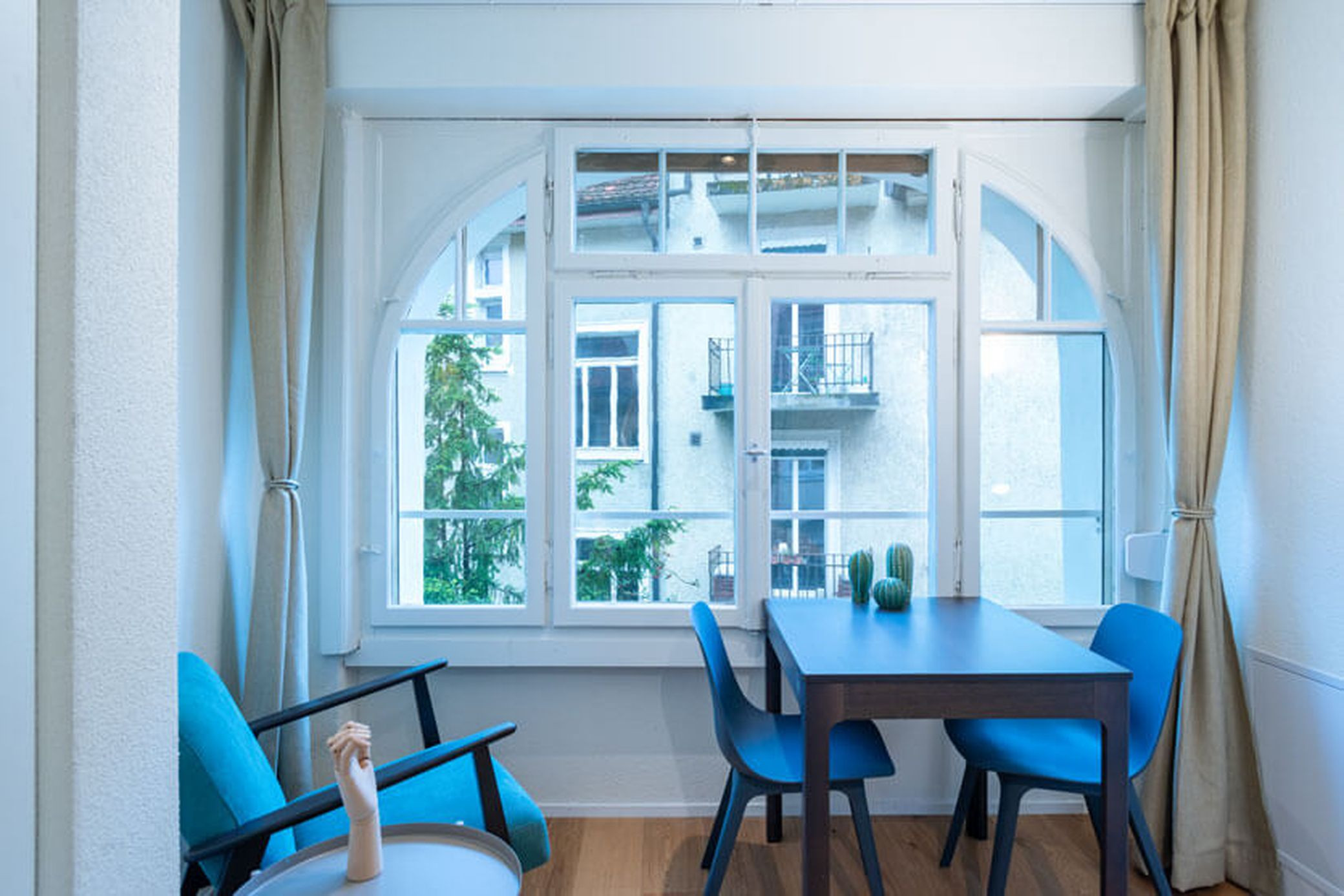 Le studio est situé à Zurich Oerlikon, dans un quartier animé de la ville de Zurich. De nombreuses entreprises nationales et internationales y ont leur siège principal grâce aux excellentes connexions avec l'aéroport et la ville. La gare d'Oerlikon est à quelques minutes de l'appartement. De là, vous pouvez rejoindre la gare centrale et l'aéroport en train en 5 minutes.