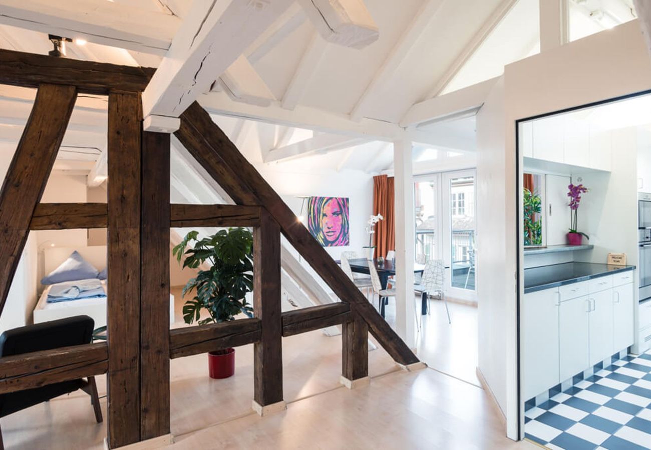 The holiday apartment called "Sun IV" lives up to its name. The apartment captivates by its unusual layout and its central location. From here you have a view of the world-famous Chapel Bridge and the Jesuit Church. The apartment has 3.5 rooms and can accommodate a total of seven guests. three double beds and a sofa bed are available. The apartment also has a private kitchen with all necessary utensils: cooker, fridge, oven, microwave and many small extras. In the bathroom you will find a toilet, shower, hair dryer and various hygiene articles. On your own terrace you can enjoy a wonderful view of the Reuss and can really relax on warm summer evenings.